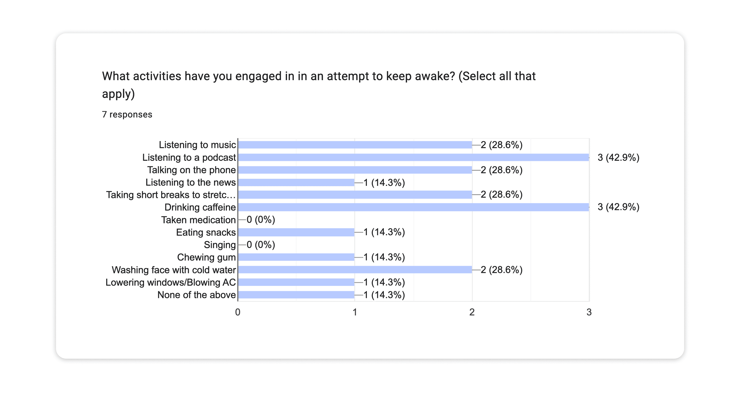 The survey revealed self-reported input on effective fatigue-prevention strategies and technology preferences while driving that helped shape our solution.