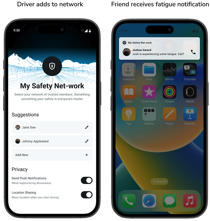 When fatigue persists despite earlier interventions, the system acknowledges that the driver may need help beyond the vehicle. A trusted contact from the driver’s safety network is notified, giving them the option to check in or call. Location sharing and notifications are fully configurable, keeping the driver in control while adding a human layer of accountability.
